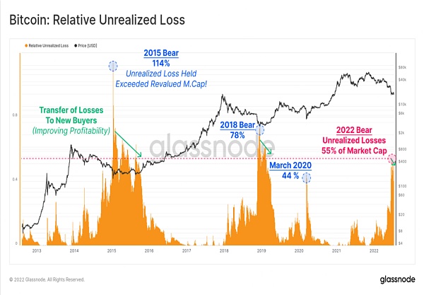 下圖顯示了未兌現的總損失占當前市值的比例。在這里,我們可以看到,未兌現虧損總額相當于市值的55%左右,高于2020年3月,與2018年熊市低點的規模差不多。