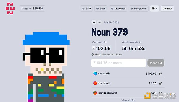 Nouns DAO——「一個名詞,每天,永遠」是?Nouns?主要項目的口號。底層協議從特征庫中生成一個頭像,拍賣該頭像,并每天結算一次拍賣。