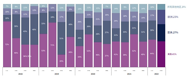 22、位于美國的獨角獸企業數量遙遙領先,其次是亞洲地區。