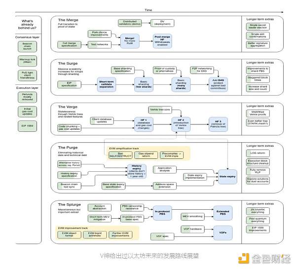 合并后,核心開發者才可以把精力用到其他重要的開發建設中,比如擴容,分片等等 (V神給出過以太坊未來的發展路線展望,見下圖)