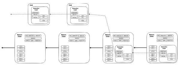 等到信標鏈合并到以太坊主網,以太坊的PoW共識層將被替換成信標鏈(PoS),交易狀態則是繼承自原以太坊主網。