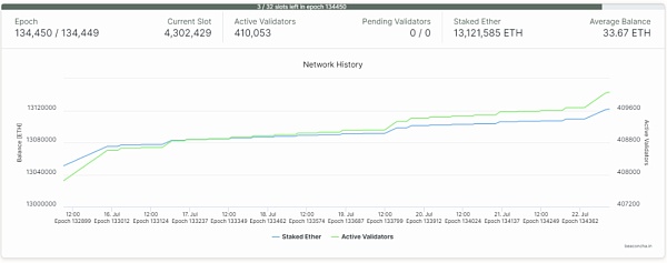 在信標鏈方面,目前驗證者數量已經超過41萬個,ETH質押數量超過1310萬個,占到總供應量的約11%。從上線至今,信標鏈一直穩定運行,信標鏈已經為合并做好準備。