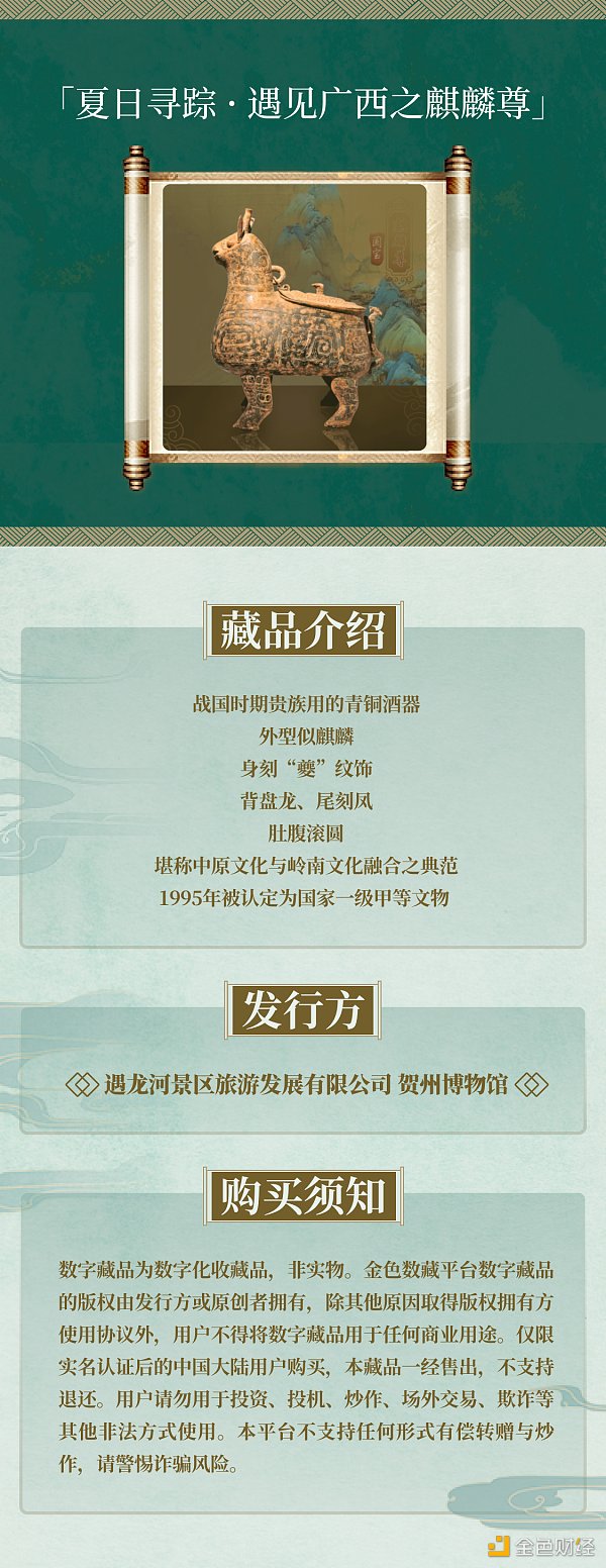 「夏日尋蹤 · 遇見廣西」系列集齊本期四款普通藏品,可兌換1份至尊版「遇見廣西 · 麒麟尊」藏品,為保證藏品的稀缺性,兌換成功后原有藏品將被燃燒。