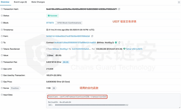 可以看到在上圖交易詳情中并沒有調用 TetherToken 合約的 issue(uint) 增發函數,而是調用了 MultiSigWallet 合約的 confirmTransaction(uint) 函數完成的增發操作。