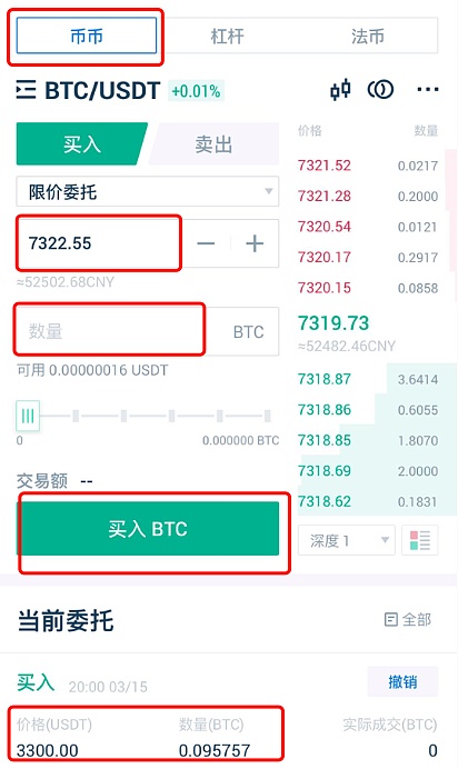 在幣幣交易的購買界面,你可以輸入你想購買的單價,雖然現在當前價格是7322美元,但是你想以3300的價格買,也是可以的,然后輸入你購買的數量,點擊買入就可以了。如果是以當年價格購買,就可以立刻成交。如果低于當前價格購買,就會在當前委托下面顯示。