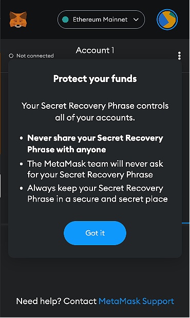 MetaMask 提醒用戶注意助記詞的使用? ?來源:MetaMask