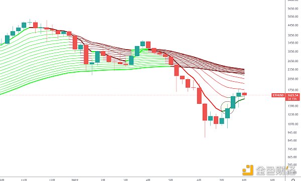ETH走勢與之類似,圖中圓圈周線站上拐頭上行的趨勢線后便一路沿線上行,本周調整并未跌破下方支撐,點位1530-1540,不破整理后就有再次向上機會,也就是中期多頭趨勢仍在,上方壓制1750.
