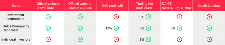 投資額度 1000BUSD 起,可以獲得交易稅中 (BUSD+BHO)3% 的翻倍回報,回報期結束后,收益將停止。投資成功之后將會默認成為一名相當于 DAOs 社區倡導者,會授權相應的邀請連接。通過鏈接分享可以去組建屬于自己的 DAO 社區,DAOs 社區會獲得 DAO 池的 10%+交易稅的 5% 分成,同時該社區部落的名稱和 logo-ubxx 將會出現在官方的展示區。DAOs 社區可以根據自己最終的信用值獲得 VC 池的無抵押信用貸款。DAOs 社區投資人可以編輯自己的名稱和 logo,此數據將全部保存到鏈上