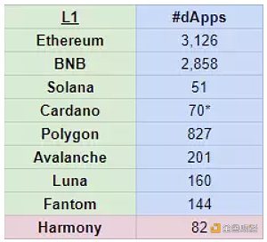 即使定性比較,我們也可以看到 Harmony 生態的增長。與其他生態系統比較而言,Harmony 上的 dApps 有 82 個,大于 Solana (51) 和 Cardano (70) 的數字,但小于 Avalanche(201)、Luna (160) 和 Fantom (144)。