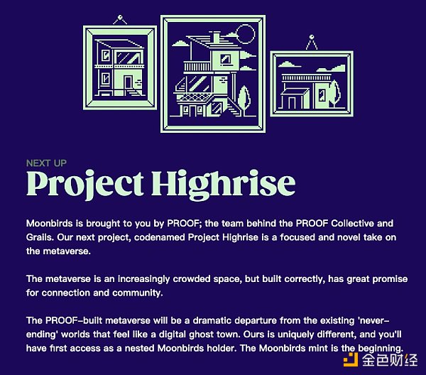 其二,Moonbirds 持有者將可以獲得?PROOF 接下來將要推出的元宇宙項目「Project Highrise」的先行訪問資格。