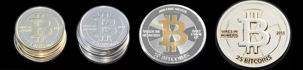 Casascius 實體比特幣由銀、鍍金或是純金打造,有 0.5BTC、1BTC、5BTC、25BTC、100BTC、1000BTC 等面額。
