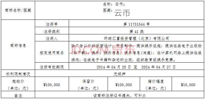 交易介紹里顯示,萊特幣商標注冊人為深圳遠為文化有限公司,注冊時間分別為2015年7月14日及2015年9月28日。商標使用范圍有一定限制。云幣商標的注冊人是環球匯富管理(北京)有限公司,注冊時間為2014年4月28日。
