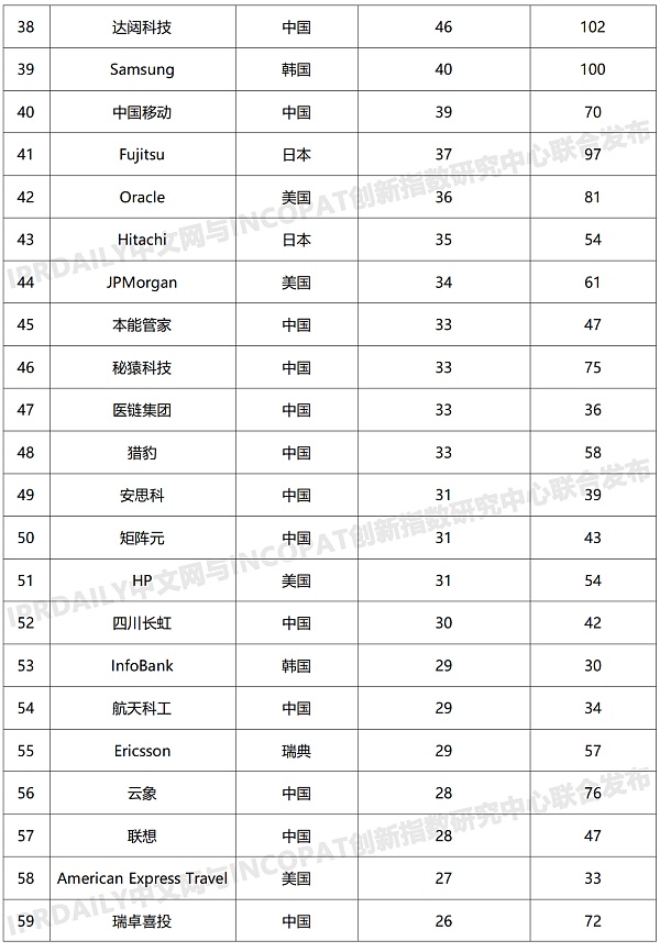 其中前三名均為來自中國的巨頭,分別是阿里巴巴(支付寶)、騰訊和中國平安。阿里巴巴(支付寶)以1505件專利位列第一,騰訊以724件專利排名第二,中國平安以561件專利排名第三。特別是阿里巴巴(支付寶)累計達到2344件,以數倍的優勢大幅領先第二、三、四名。