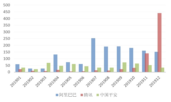 騰訊的區塊鏈專利主要來自于騰訊科技(深圳)有限公司,此外有一小部分來自騰訊云計算(北京)有限責任公司和深圳市智稅鏈科技有限公司。騰訊2019年區塊鏈發明專利申請數量集中在11月和12月增長,12月單月更達到441件。