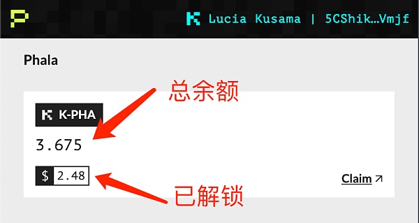 在 Khala 資產卡片中您可看到您獲得的總余額 和已解鎖 PHA 數量(34%已解鎖的獎勵已直接發放至您Khala賬戶中,無需在本錢包手動領取)。