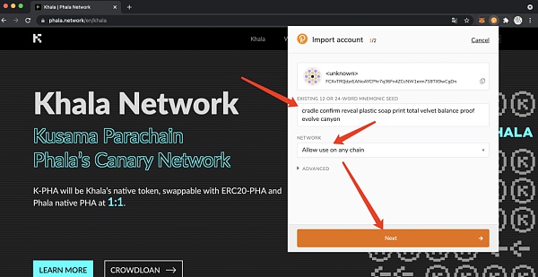 輸入 KSM 賬戶助記詞(切勿向他人透露您的助記詞),每個單詞之間用空格分隔。在下方下拉框中選擇第一個“Allow use on any chain(允許在任何鏈上使用此賬戶)”。點擊 NEXT(下一步);