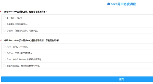 資產追回對dForce及其平臺用戶而言,可能是個不錯的結果。近日dForce團隊發起的用戶態度調查問卷(如下圖)在社區流傳,我們暫未獲悉調查結果,但是這份問卷內容值得我們深思。
