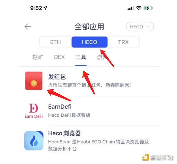 2、選擇 HECO 專區,點擊“工具”分類,看到了第一個就是發紅包應用