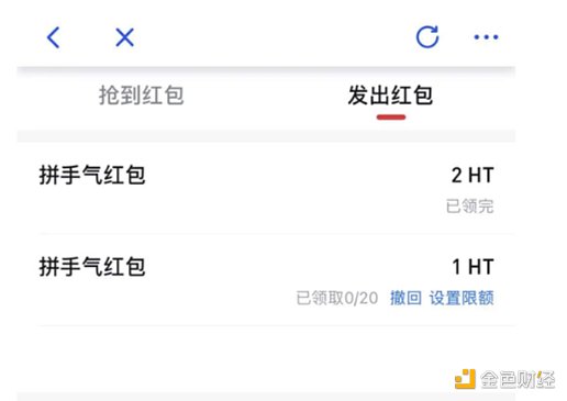在發送記錄列表中,我們同樣可以設置限額和撤回紅包。撤回的意思是沒有領完的紅包金額會原路返回至您的賬戶,但是請注意發送紅包服務費和礦工費不在返回之列。