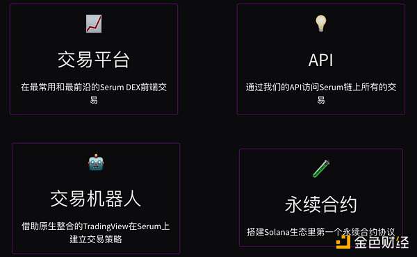 正如前文所述,Bonfida 是 Serum 的「旗艦前端」,可以為 DEX 提供更好的交易體驗。目前 Bonfida 提供的功能除了基于 Serum 的基礎交易功能以外,還有程序化交易機器人、Serum API 以及即將上線 Solana 鏈上的首個永續合約協議。