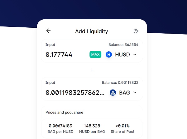 5.點擊選中HUSD/BAG交易對,并選擇相應流動性數量。
