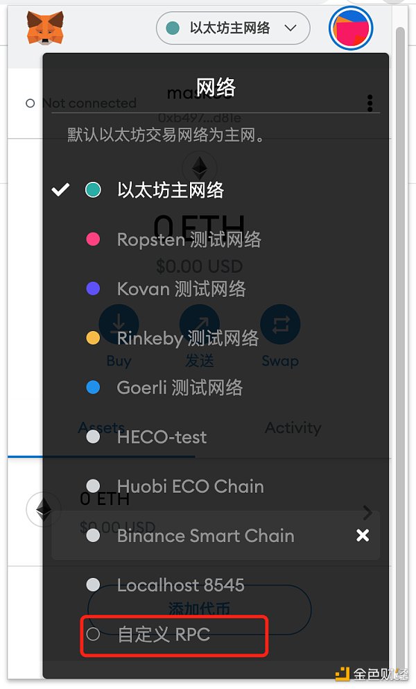 1.1在MetaMask錢包中,點擊菜單(系統默認以太坊主網絡),下滑并選擇“自定義RPC“。