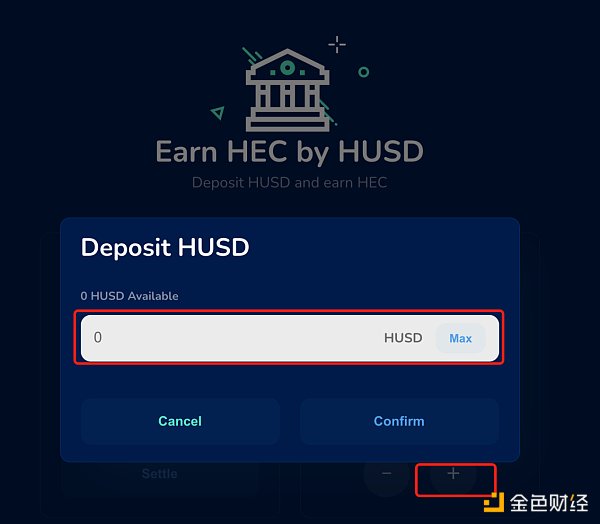 [授權]HUSD成功后,點擊[+]并輸入存入HUSD的數量,最后點擊Confirm完成確認后,即可開始無損挖礦HEC了。