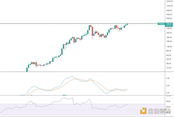 ETH價格再創歷史新高,周線若能有效突破前頂一帶壓制線,后續回踩整理后將會展開更為強勢的行情。