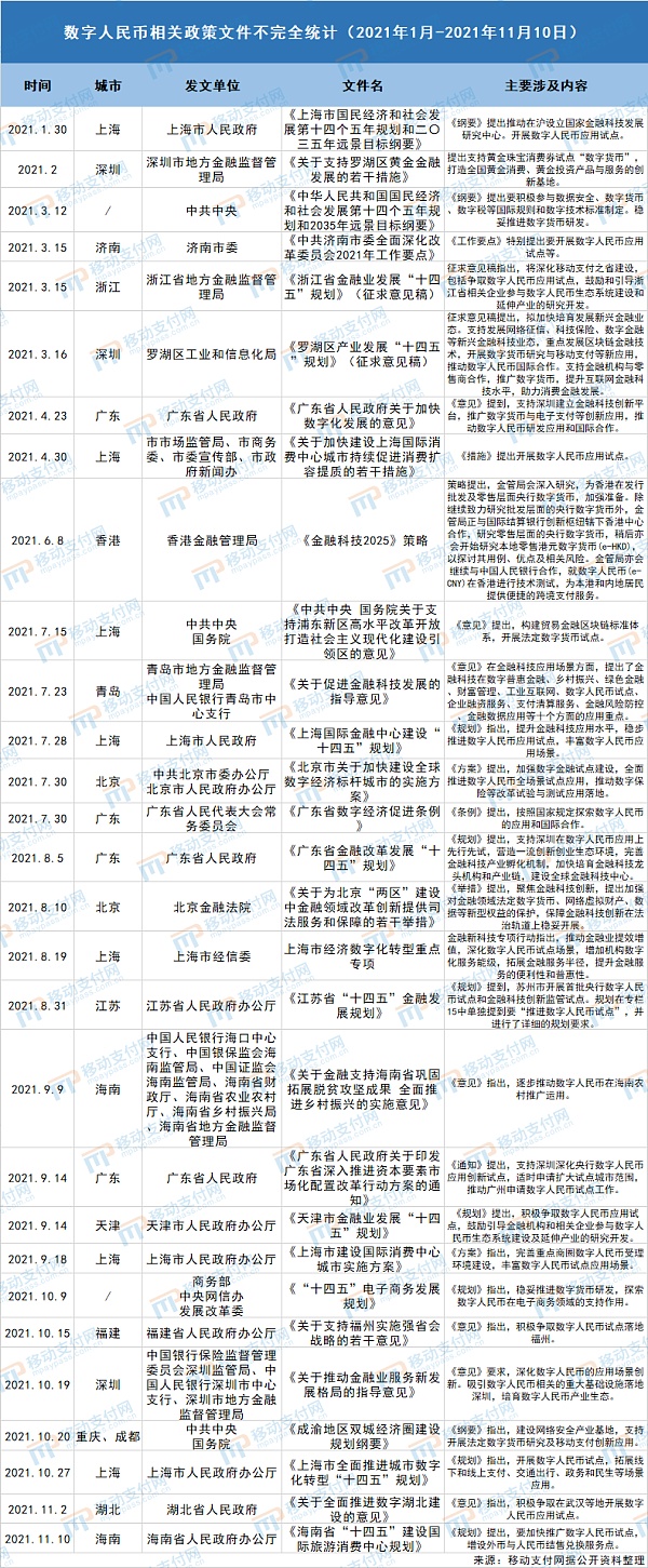 目前,涉及數字人民幣的政策文件如中共中央、商務部,央行、地方政府等,內容包括金融科技、自由貿易、跨境電商、經濟改革等多個方面。
