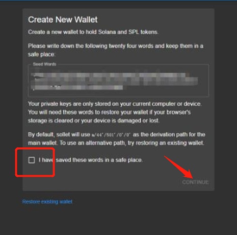 打開注冊網址,在頁面會又自動生成的助記詞,記得要備份保存好助記詞。然后點擊方框中打鉤后,點擊右下角的[continue]就可以。
