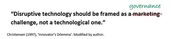 盡管這些戰略在商業理論中已經明確提出了幾十年,并被許多企業和商業領袖所理解和接受,但過去和今天的公司仍然在努力實施這些戰略,并接受顛覆性的技術變革,以獲得持續的商業成功,甚至是市場主導地位。我們推測,這些戰略的實施障礙主要是治理上的挑戰。
