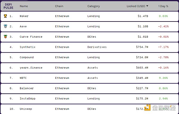DeFi排名前十鎖倉量 數據來源:DeFi Pluse