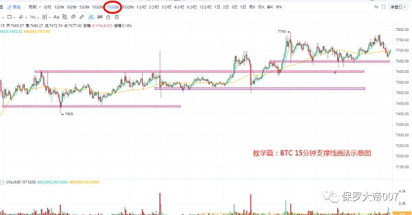 BTC已從7610最高漲到7790,180美元的空間。現在大餅15分鐘可近似看作一個箱體震蕩。箱體震蕩(矩形盤整)如何操作?可見公眾號“保羅大帝007”《幣圈技術面21講·盤整形態》