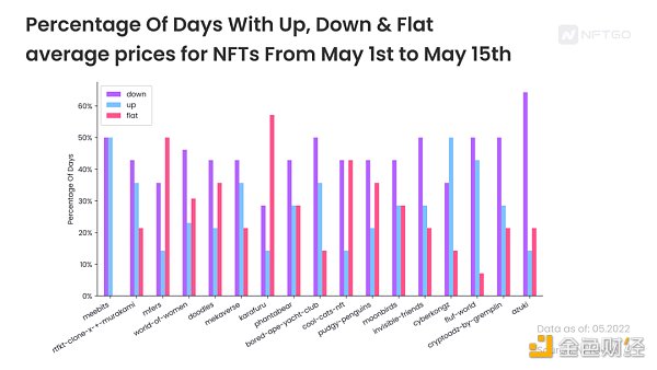 而在 5 月初到 5 月中旬階段,NFT 市場也跟隨數字市場進入一定的冷靜期,明顯看出,價格下跌的天數比例相較于前期牛市明顯增多,上漲天數的比例越來越少,整體市場處于下行區間。在熊市下,NFT 頭部項目表現由整體性市場情緒所把控,即使是頭部項目,下跌天數比例也往往多于上漲天數。