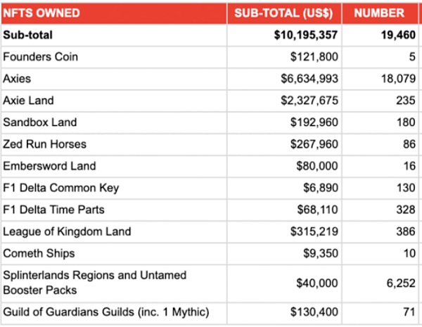 6.也有大約1000萬美金的各類NFT資產由YGG下屬DAO管理。