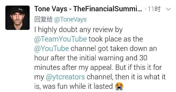 Tone Vays表示,從單個視頻警告到整個頻道被YouTube禁掉,這一過程進行的很快。我非常懷疑YouTube團隊的評論,因為YouTube頻道在視頻被警告一小時后和我上訴30分鐘后就被關閉。