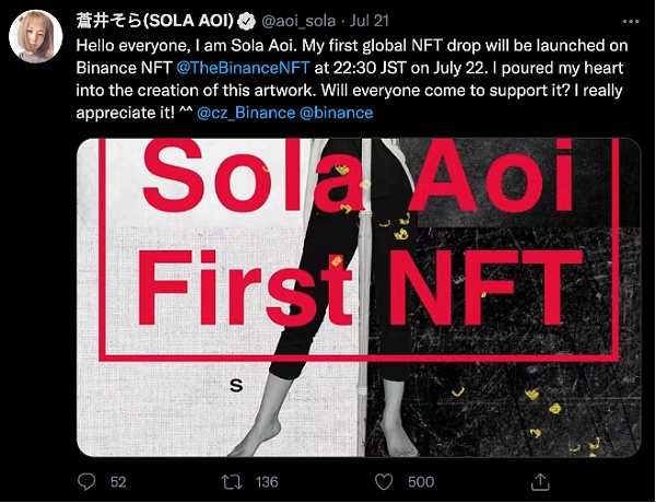 此外,國民老師蒼井空也通過 BINANCE NFT 發行了自己創作的第一套 NFT 作品。