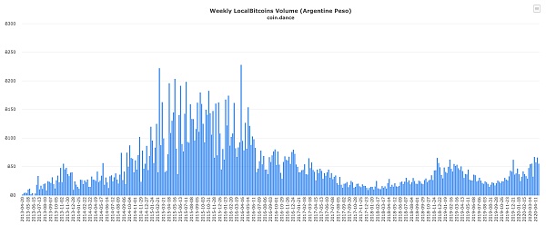 據著名的點對點交易所LocalBitcoins的數據,南美國家如阿根廷、委內瑞拉和智利目前按當地法幣計價的比特幣交易額最近的確顯著性增加。見下圖。