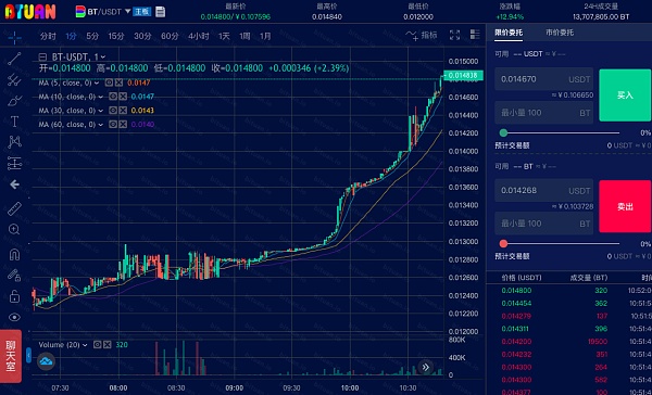 從去年開始,幣團對BT進行了通縮,并將當季凈利潤的50%用于回購BT,直至流通量由10億變為1億,下次回購時間預計在5月初!也就是說,用戶所持有的BT會在回購過程中最少增值10倍!并且受供應量縮減消息的影響,BT價格應聲上漲,價格走勢良好也會是持久的狀態,有望持續向上突破。