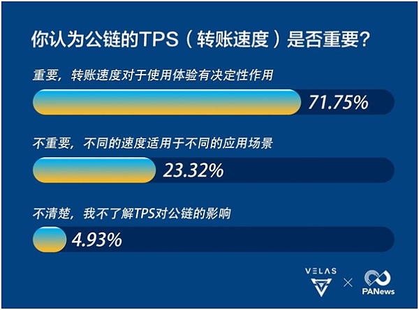 在本次調查人群中,71.75%的用戶都認為公鏈在發展的過程中,TPS起著決定性的作用。Velas和PANews進一步訪談和了解后發現,無論是開發者或是用戶,都希望區塊鏈應用能帶來的是“無感化”過度,即無論資產轉賬、數據打包或傳輸、運行效率都盡可能和中心化應用別無二致,而高TPS則是無感化過度的先決條件。