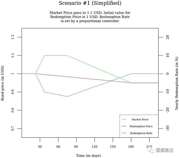 為了簡單的示例,我特意省略了一些細節。大多數時候,市場價格和贖回價格之間會有小的偏差,控制器可以設置為噪音分類。此外,理想情況下,贖回利率應該由PI控制器來修改,這有助于最小化市場/贖回價格偏差(如在理想和簡化場景中所示),甚至通過PID控制器可以通過積分器來減少最大偏差。(有可用于PI的智能合約代碼,可能很快就會用于PID控制器)