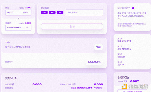登錄網站后可免費 Mint 代幣 ASTR,然后質押,隨后獲得 IDO 門票,該門票可用于投資 Astraly 上的項目。