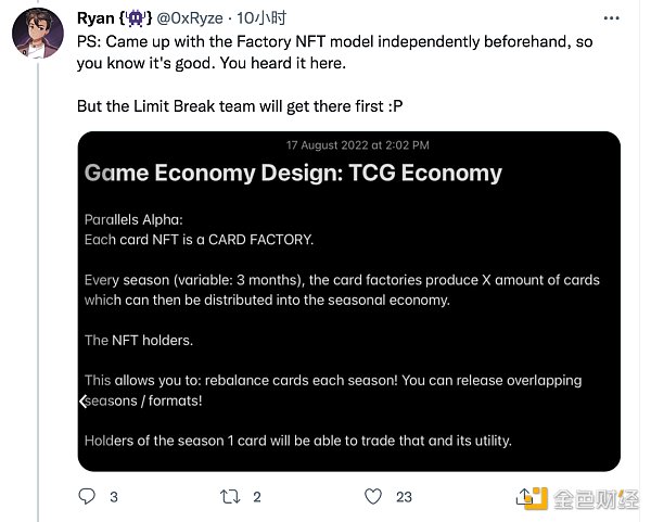 他還提到稱,此前已經有項目方(Parallels Alpha)提出了 工廠 NFT 模型,而 Limit Break 團隊可能會首先采用這種模式。