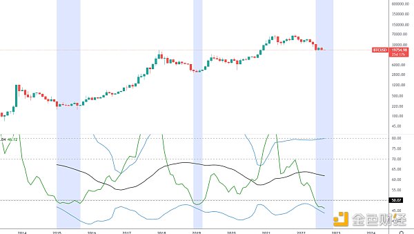 我們從上方BTC月線動力指數看,一旦圖中綠線跌至平衡線以下,歷史上BTC均已跌至這一輪熊市大底區間,而該線一旦重新站回至平衡線以上,后面均走出新一輪牛市,而目前綠線再次已跌至平衡線下方,表明BTC可能也已進入本輪熊市底部區域,不過后面牛市啟動還需要筑底時間,多點耐心。