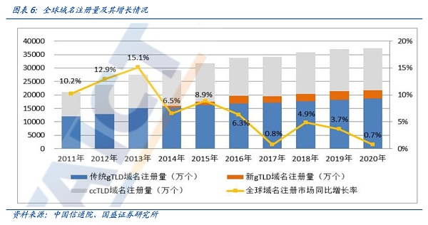 傳統域名市場已經接近飽和。隨著互聯網快速發展,域名市場在過去20年增長迅速,但目前已經接近飽和。根據中國信通院數據,截至 2020?年底,全球域名注冊市場規模為3.74億個、我國域名注冊市場規模為4300.8 萬個,其中新通用頂級域(gTLD)域名注冊市場規模分別為 3125.2 萬個和718.1 萬個,較上年有一定下降。