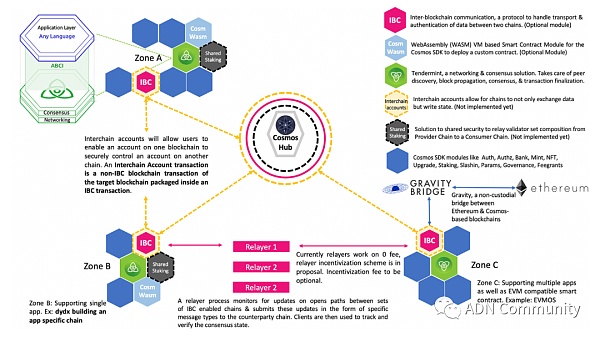 Cosmos 生態系統作為一個模塊化鏈網絡運行,其中一些是直接互連的,一些是通過 Cosmos 樞紐相互連接的。它提倡“中心輻射”模型,包括協議、SDK、令牌、錢包、應用程序、存儲庫、服務和工具。Cosmos 基礎設施的發展得到了 Ignite、Inter Chain Foundation 和 Confio 等多個關鍵貢獻者的推動。開發人員可以使用 Cosmos SDK 的現有模塊,修改它們或創建新模塊以根據他們的要求啟用功能。開發人員還可以靈活地選擇編碼語言、安全模型和支持的事務類型,以及其他選擇。