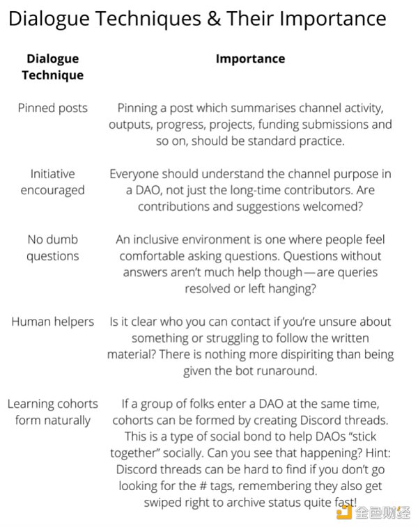 許多 DAO 具有不同層次的復雜性、不同的工作組、不同的技能組合和不同的活動。一個屋檐下有多個高度流動的子社區。新來的人通常遇到的第一個問題是:每個人都在做什么,我可以適應哪里?我適合和誰在一起?入職和入職培訓是關鍵的成功因素。有經驗的 DAO 人會做很多上下文切換,并且可以非常迅速地改變位置,Discord 或 Discourse 頻道中的討論可以快速進行,并且經常會參考以前的事件或討論。一個沒有牢牢掌握基礎知識的新人很容易認為討論是不可理解的并離開。