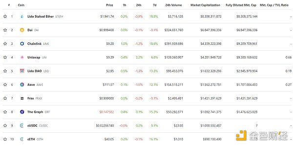 DeFi項目鎖定資產前十排名及鎖倉量 數據來源:defillama