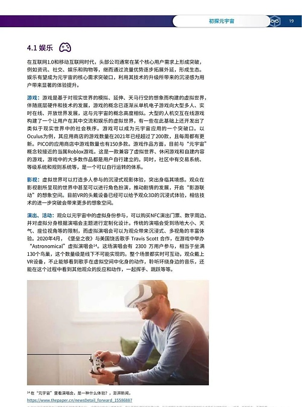 XRP/HKD+0.53%2021年可以被稱為“元宇宙”元年。繼2021年3月沙盒游戲平臺Roblox將“元宇宙”概念放入招股書中,被稱為“元宇宙”第一股后,Facebook更名為Meta, 引發全球范圍內資本市場和業界的廣泛討論,形成元宇宙現象。邁入2022年,元宇宙仍然熱度不減。2021年底上海市正式將元宇宙納入電子信息產業發展“十四五”規劃,新年伊始各地陸續召開的地方兩會中“元宇宙”也成了熱詞。作為尚未落地的概念性新興事物,“元宇宙”充滿了未知。什么是元宇宙?元宇宙的技術生態有何構成?未來元宇宙中的工作和生活是什么樣?將為相關產業帶來哪些變革?元宇宙落地面臨的挑戰是什么?帶著對這些問題的探索,這份 《初探元宇宙》報告,在全景呈現元宇宙生態圖譜的基礎上,從元宇宙的起源定義、基礎硬件和核心技術、十大應用場景展望、以及機遇與挑戰等四個維度進行了解析,以期多方位為各界前瞻這一新興技術,在互聯網3.0的浪潮中奪得先機。