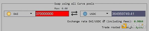 此時,攻擊者將針對 UniV3 頭寸和 3Pool 進行出售。以 10.7 億美元計,他們將獲得約 105 億美元的 USDC。PSM 將 2.5 億美元的 USDC 注入 DAI,并再次交易。這方面的損失將為 2500 萬美元。但這將引發另一筆 6.5 億美元的 DAI 交易,以流動性的形式進入市場。